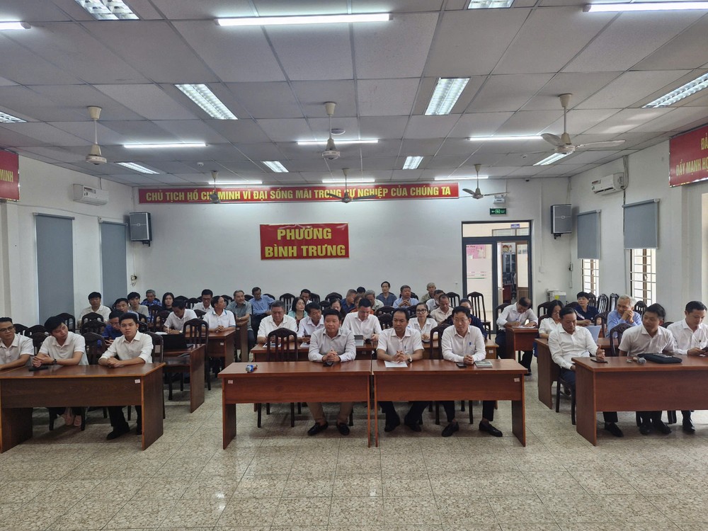 Các đại biểu tham dự hội nghị. Ông Nguyễn Chí Thanh - Chủ tịch UBND phường Bình Trưng cho biết theo Quyết định số 202 của Thủ tướng Chính phủ, TP Thủ Đức được định hướng quy hoạch 11 khu vực trọng điểm phát triển chiến lược, trong đó có Khu liên hợp TDTT Quốc gia Rạch Chiếc phường An Phú (nay thuộc phường Bình Trưng).