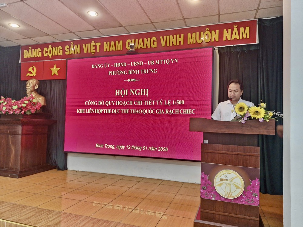Ngày 12-1-2026, UBND phường Bình Trưng (TP.HCM) tổ chức hội nghị công bố quy hoạch chi tiết tỉ lệ 1/500 Khu liên hợp thể dục thể thao (TDTT) Quốc gia Rạch Chiếc diện tích 186,78 ha.